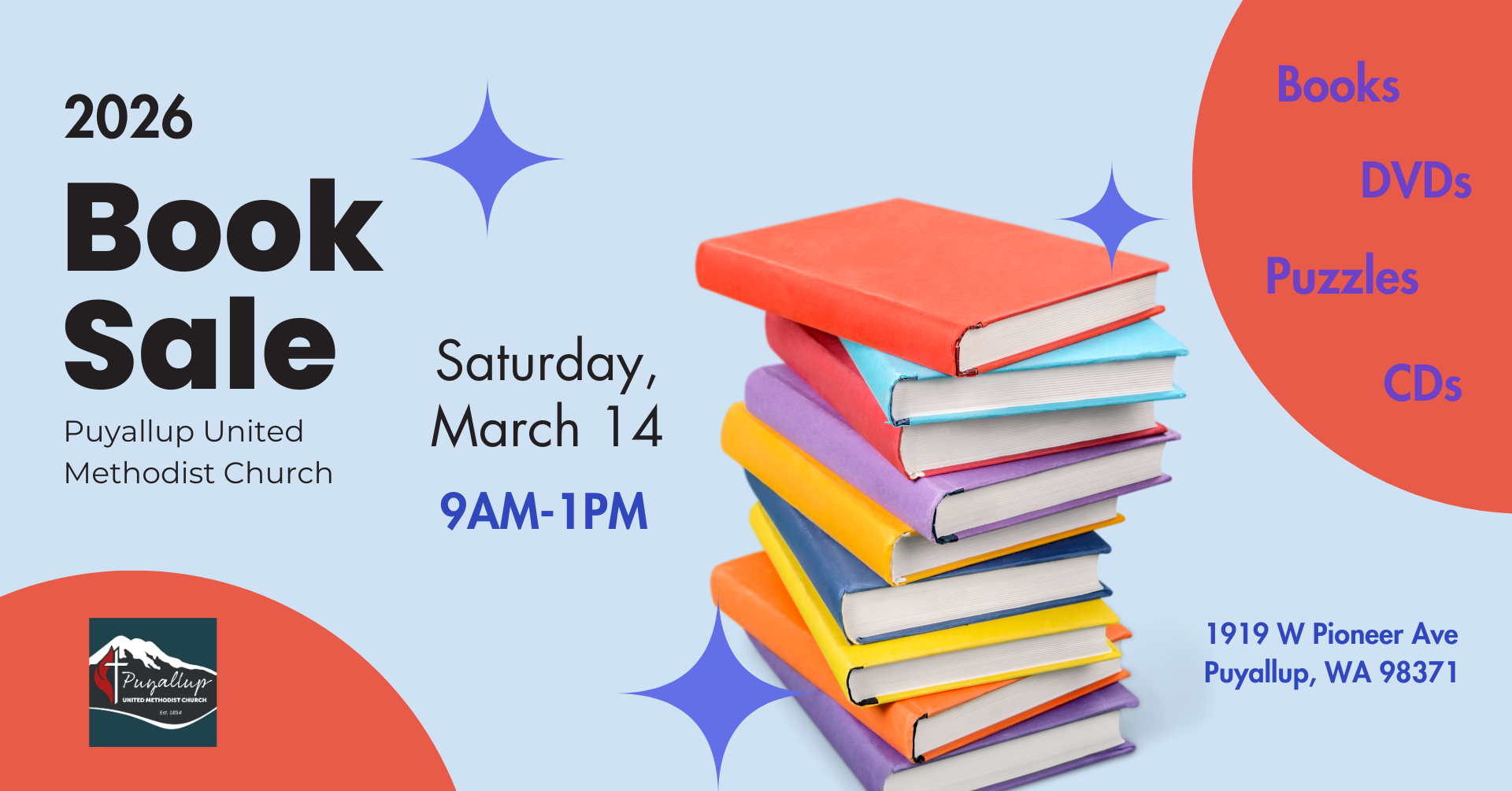 Come shop our annual Book Sale on Saturday, March 16, 2024, here at Puyallup UMC!